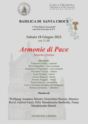 La Provincia Toscana dei Frati Minori Conventuali della Basilica di Santa Croce a Firenze organizza, presso la medesima Basilica, lo spettacolo di musiche e poesie intitolato “Armonie di Pace”. Verranno eseguite musiche di Wolfgang Amadeus Mozart, Ouverture da “Le Nozze di Figaro”, Ave verum corpus e Agnus Dei da “Messa dell’Incoronazione”; di Gioacchino Rossini, O salutaris hostia da “Petite Messe Solennelle”; di Maurice Ravel, Pavane pour une enfante défunte; di Gabriel Faurè, Pie Jesu da “Requiem”; di Felix Mendelssohn Bartholdy, Hear my Prayer; di Fanny Mendelssohn Hensel, Ouverture (n.1); Sie sind dahin gegangen (n. 10); Singet got lobsinget dem herrn (n. 16) da Oratorium “Nach Bildern der Bibel”.